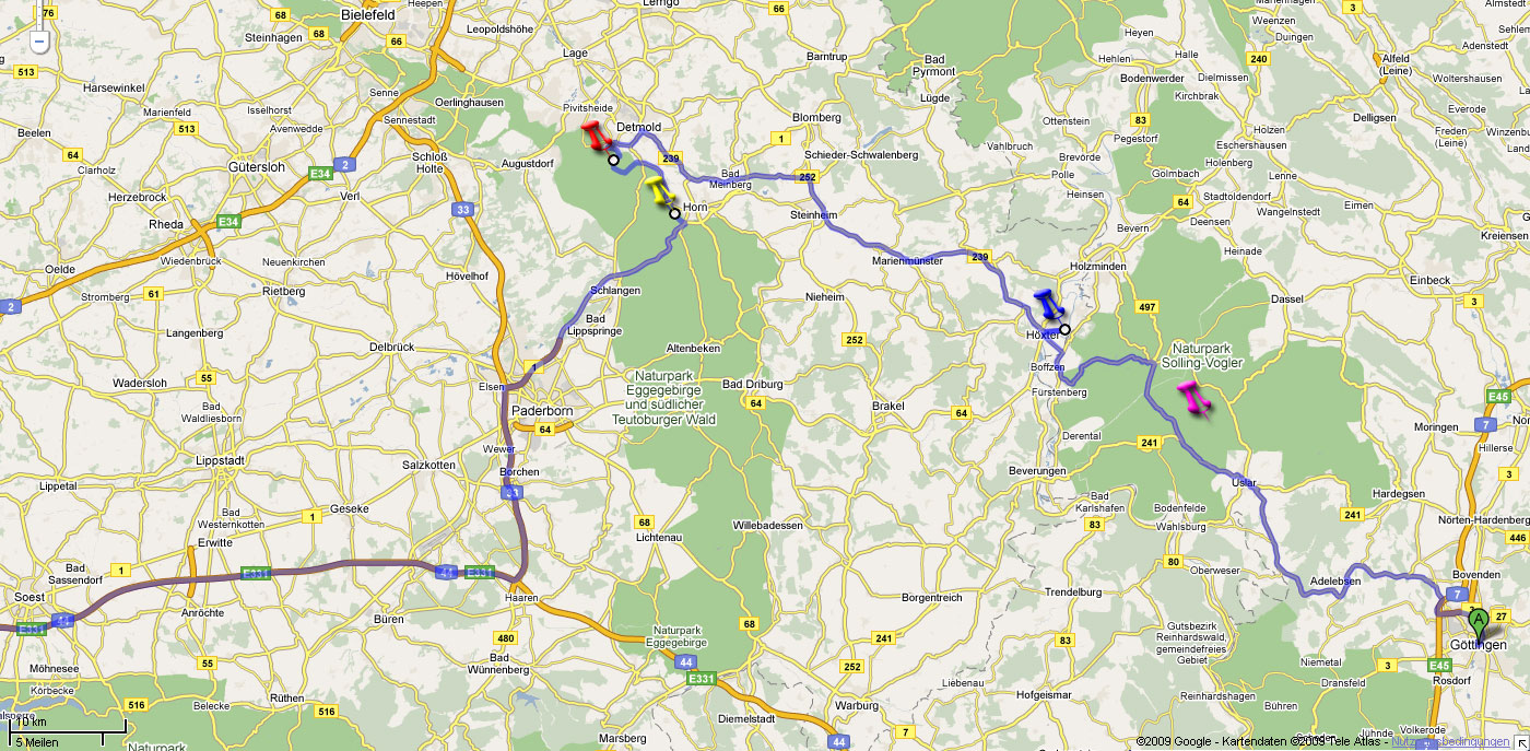 Erstmal der kulturelle Teil, vertreten durch Schloss Corvey mit dem Grab von Hoffmann von Fallersleben in der Nähe von Höxter (blauer Pin).Danach geht's fließend über zur Natur mit Hermanns-Denkmal bei Detmold (roter Pin) und den ebenfalls in der Nähe befindlichen Externsteinen (gelber Pin).